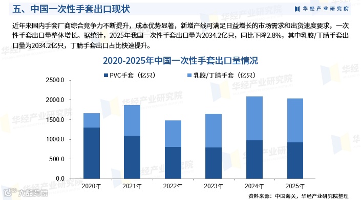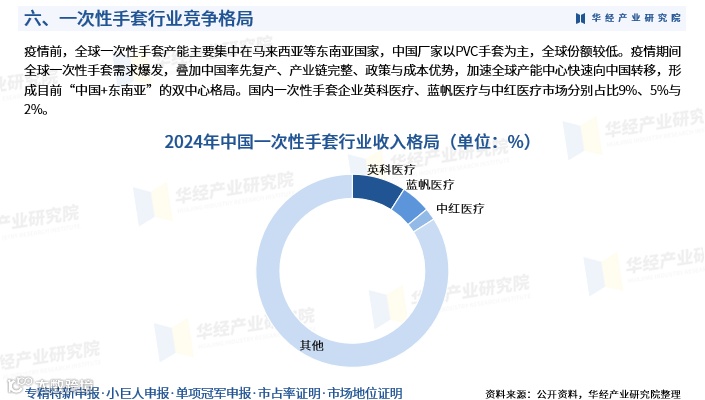 2025年我国一次性手套出口量为2034.2亿只,同比下降2.8%,但丁腈手套出口占比快速提升。疫情前,全球产能集中于马来西亚等东南亚国家,中国以PVC为主、份额较低;疫情期间,依托率先复产、完整产业链及成本优势,中国迅速承接全球产能转移,形成“中国+东南亚”双中心格局。英科医疗、蓝帆医疗、中红医疗在国内市场占有率分别为9%、5%、2%。