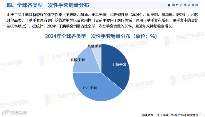依托出色的化学性能(不致敏、耐油、无毒无味)与物理性能(高弹性、防静电、轻巧),丁腈手套适用场景广泛。2024年其销量占全球一次性手套总销量的36%,并呈持续上升趋势。