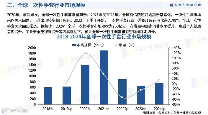 2020年前,全球一次性手套市场平稳运行;疫情爆发后需求激增,2021–2023年随防控常态化,采购回落、库存积压明显;2023年下半年起,下游库存逐步消化完毕,需求回归常态。2024年全球市场规模达750亿元,预计在发展中国家消费能力提升、疫后健康意识增强及工业安全重视度提高等驱动下,将保持稳定增长。