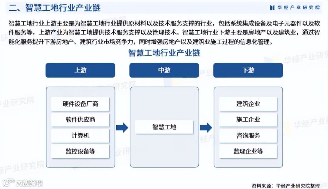 上游主要为系统集成设备、电子元器件及软件服务等技术支撑环节;下游集中于房地产与建筑业,通过智能化解决方案提升施工信息化水平与市场竞争力。