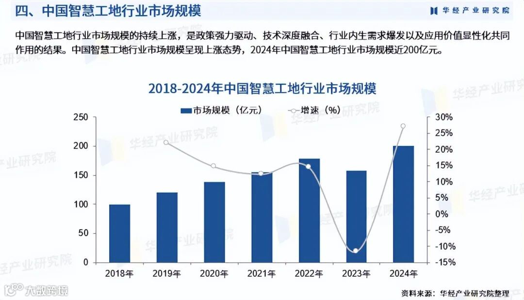 在政策驱动、技术融合、内生需求释放及应用价值凸显共同作用下,中国智慧工地行业持续扩容。2024年市场规模近200亿元。