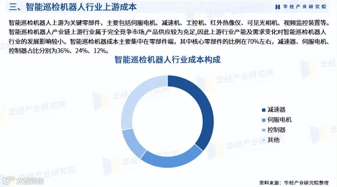 上游关键零部件包括伺服电机、减速器、工控机、红外热像仪、可见光相机及视频监控装置等。该环节属充分竞争市场,供应稳定,对整机行业发展影响有限。零部件占整机成本约70%,其中减速器(36%)、伺服电机(24%)、控制器(12%)为三大核心构成。