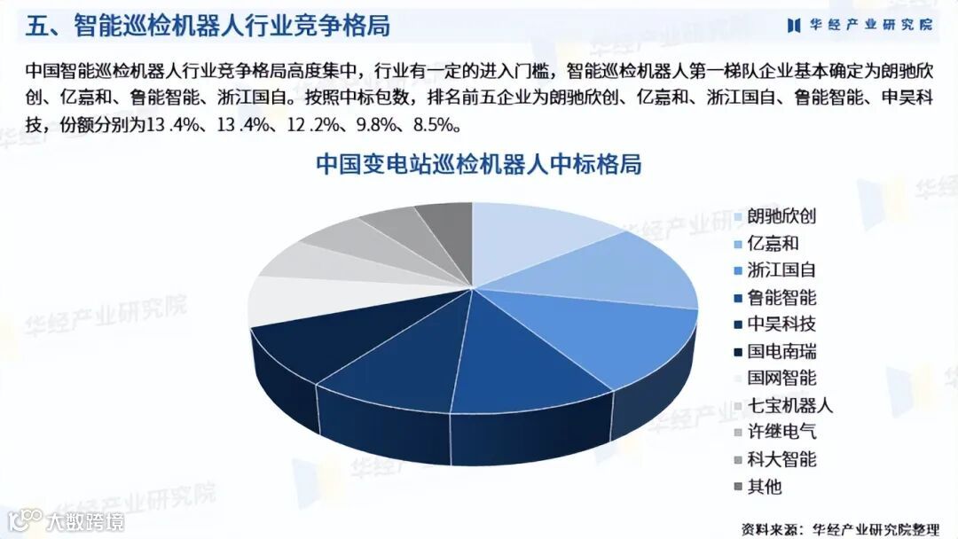 行业集中度高,头部企业已形成稳定梯队。第一梯队包括朗驰欣创、亿嘉和、鲁能智能、浙江国自。按中标包数排名,前五企业为朗驰欣创(13.4%)、亿嘉和(13.4%)、浙江国自(12.2%)、鲁能智能(9.8%)、申昊科技(8.5%)。