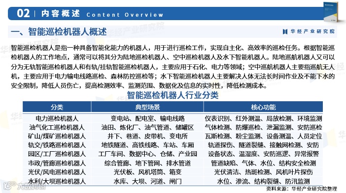 智能巡检机器人是具备自主导航、环境感知与故障识别能力的特种机器人,广泛应用于电力、石化、煤矿等高危或复杂场景。按作业环境可分为陆地、空中和水下三类:陆地型包括无轨与有轨/挂轨式,主用于变电站、配电站及工业厂区;空中型以巡检无人机为主,覆盖输电线路、森林防火等领域;水下型则突破人员作业限制,提升检测安全性、实时性与数据精度。