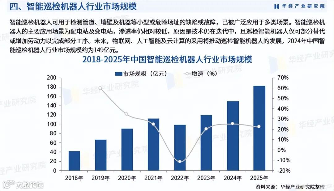 当前主要落地于配电站、变电站等电力基础设施,渗透率仍处提升阶段,受限于技术迭代进度及人机协同模式尚未完全成熟。随着物联网、人工智能与云计算技术融合深化,行业智能化水平将持续升级。2024年中国智能巡检机器人市场规模达149亿元。