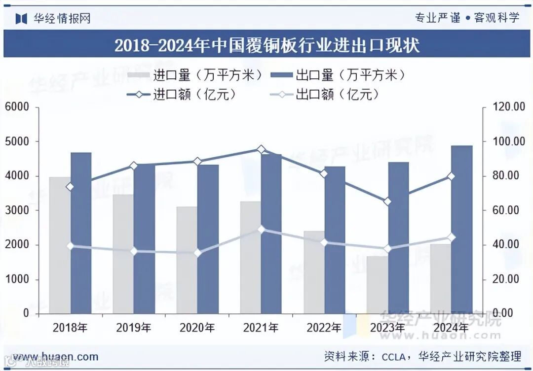2024年我国覆铜板进口量2035万平方米(+21.49%),进口金额79.87亿元(+22.03%);出口量4895万平方米(+11.12%),出口金额44.57亿元(+17.31%)。