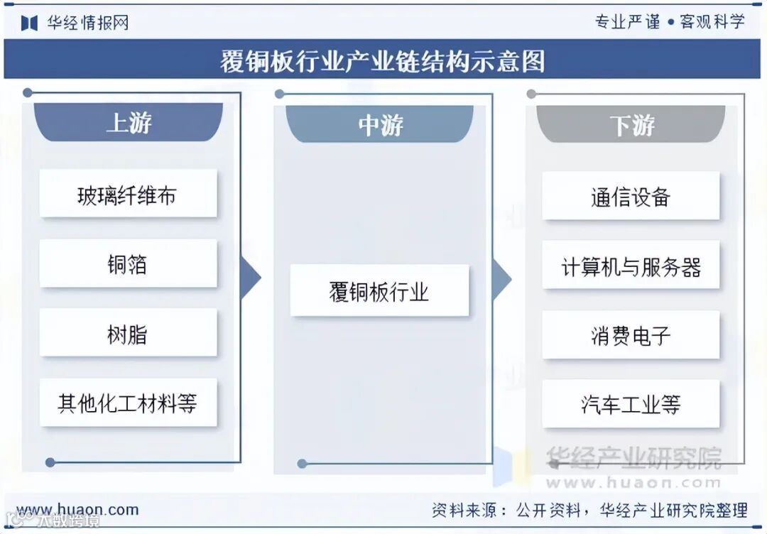 覆铜板产业链上游主要包括玻璃纤维布、铜箔、环氧树脂及其他化工原料;中游为覆铜板制造环节;下游广泛应用于通信设备、计算机与服务器、消费电子、汽车电子、工业控制、医疗设备、航空航天及军工等领域。作为PCB的直接基材,覆铜板是电子产品的“母板”核心材料。