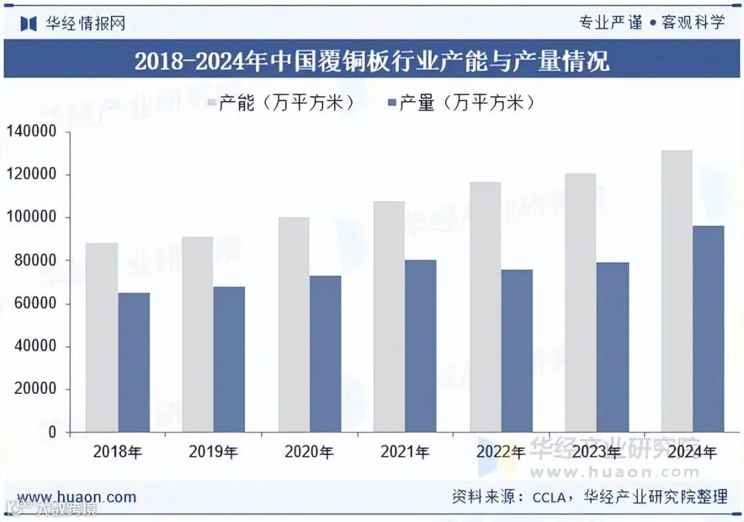覆铜板承担PCB导电、绝缘、支撑三大功能,直接影响信号传输速度、能量损耗与特性阻抗等关键性能。2024年我国覆铜板产能达131597万平方米/年,同比增长8.9%。