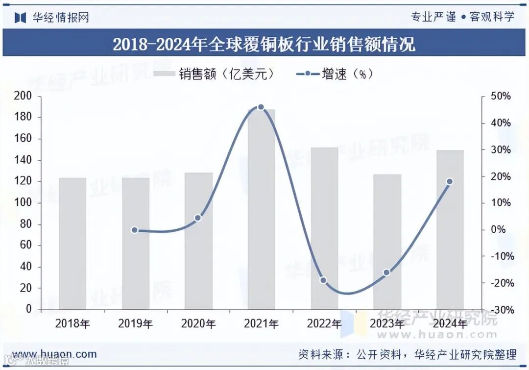 全球覆铜板产业历经美国主导、日本主导阶段,现已形成美、欧、中、日、韩、台多极化格局,产能重心持续向亚洲转移。2024年全球刚性覆铜板销售额达150.13亿美元,同比增长17.9%。