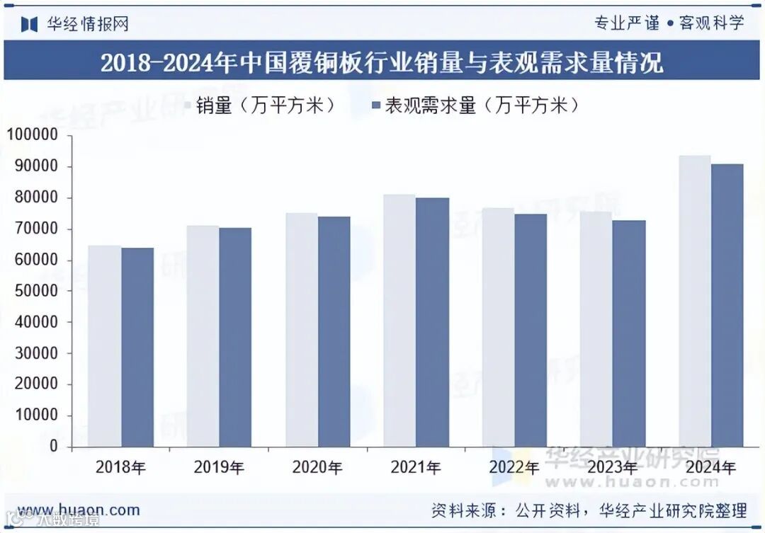 受益于AI、算力等新兴技术拉动,电子行业整体增长良好,但覆铜板仍面临阶段性供过于求压力。2024年我国覆铜板销量为93655万平方米,同比增长24.01%;表观需求量为90795万平方米,同比增长24.73%。