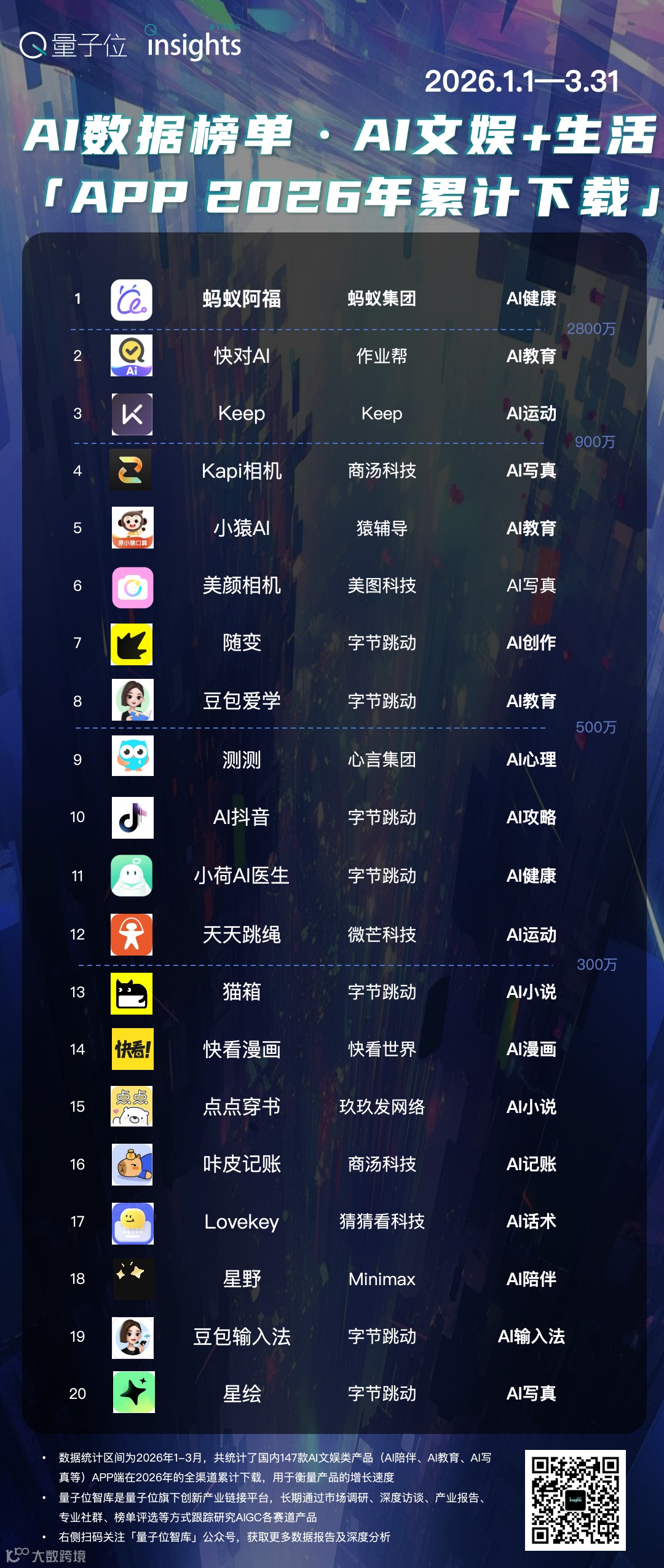 用户规模(2026年累计下载量)超过600万的共有5款产品,分别是蚂蚁阿福、快对AI、Keep、咔皮相机和小猿AI。