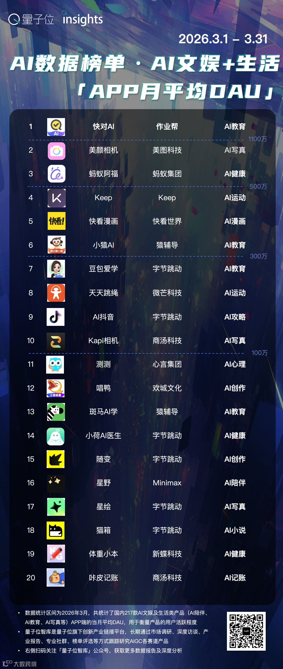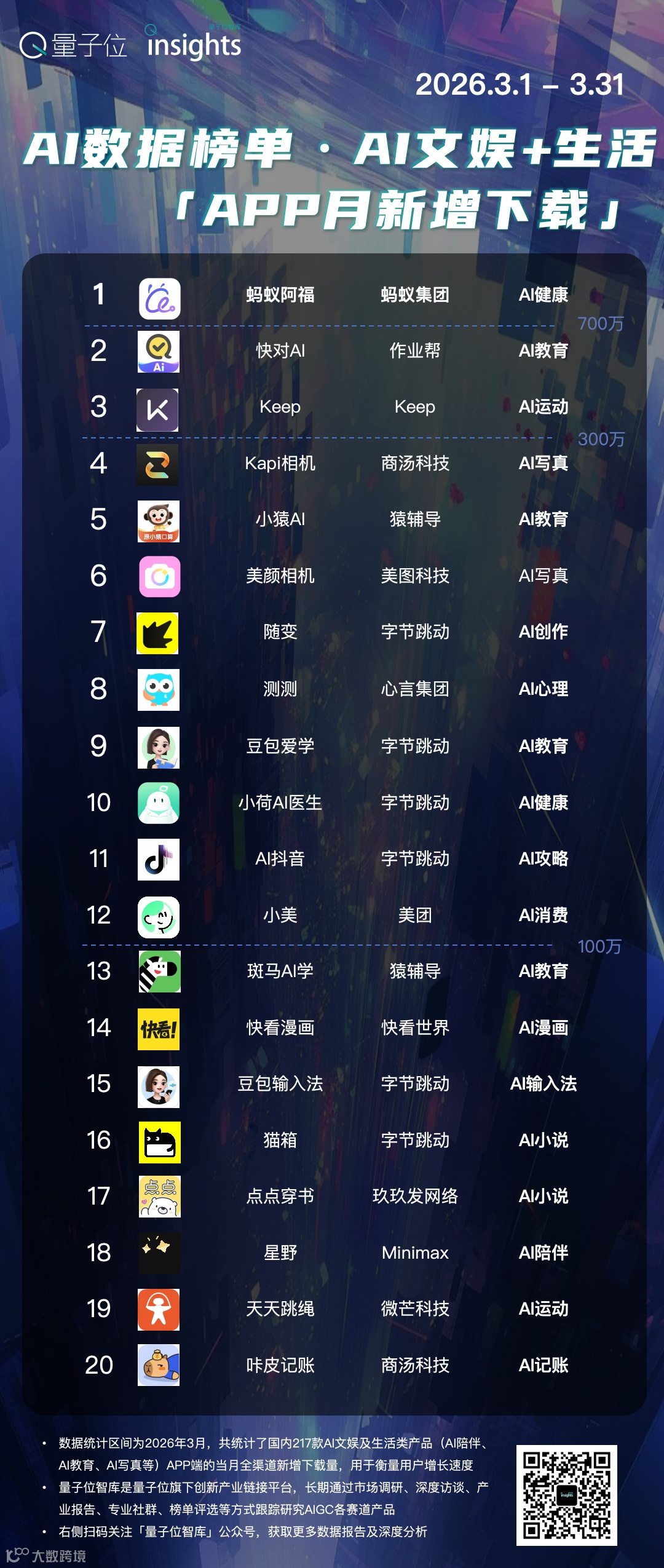 AI文娱+生活赛道APP产品,3月份数据新鲜出炉。
