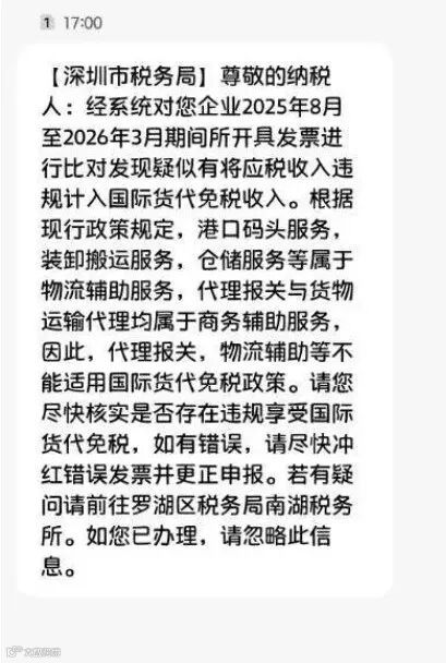 导读:近日,深圳市税务局给多家国际货运代理发出税务风险提示信息,要求纳税人提交开具发票必须合规,不得误用国家免税政策