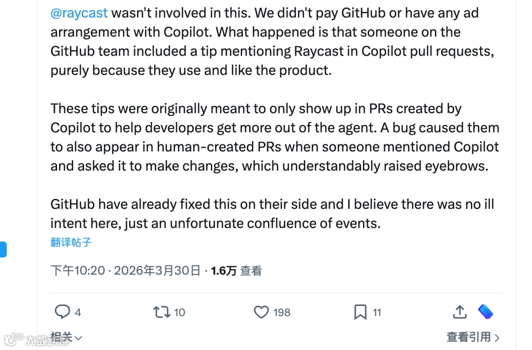 GitHub团队解释称,该广告源于内部测试:GitHub员工在Copilot创建的PR中植入Raycast提及作为帮助提示,但因技术漏洞导致其出现在用户手动创建的PR中。目前该问题已修复。