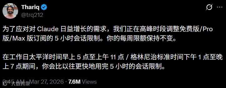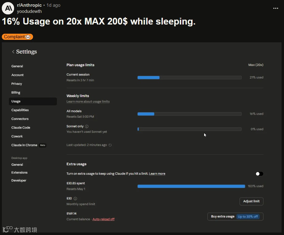 3月下旬Anthropic宣布工作日限流措施,7%高价值用户(含专业开发者)会话额度加速消耗。月付200美元的顶级订阅用户反映,每月30天仅有12天能正常使用服务。有用户仅19分钟耗尽5小时会话额度,引发开发者群体强烈不满。