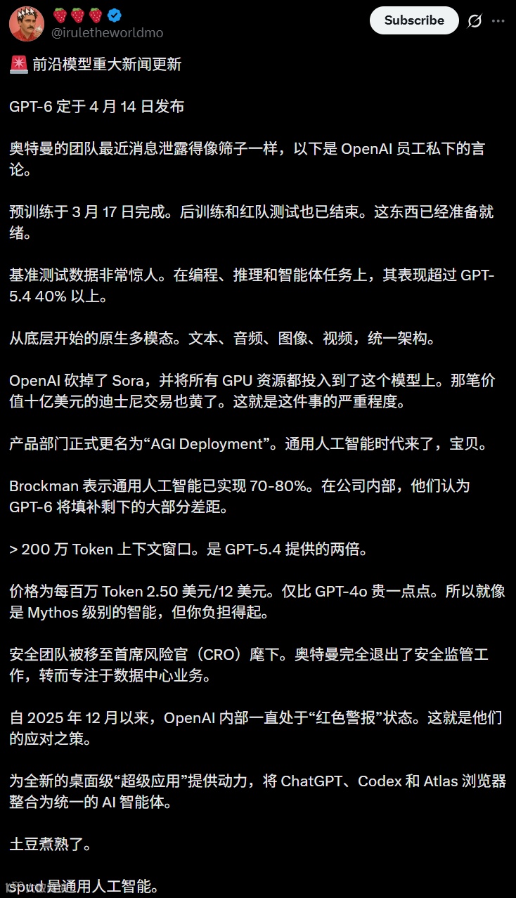 近日关于"GPT-6"代号Spud模型的消息引发热议,该模型或将整合ChatGPT、Codex和Atlas浏览器功能。虽然官方已辟谣,但市场热情不减。与此同时,Anthropic研发的Claude Mythos因算力需求过高导致服务器拥堵,落地受阻。