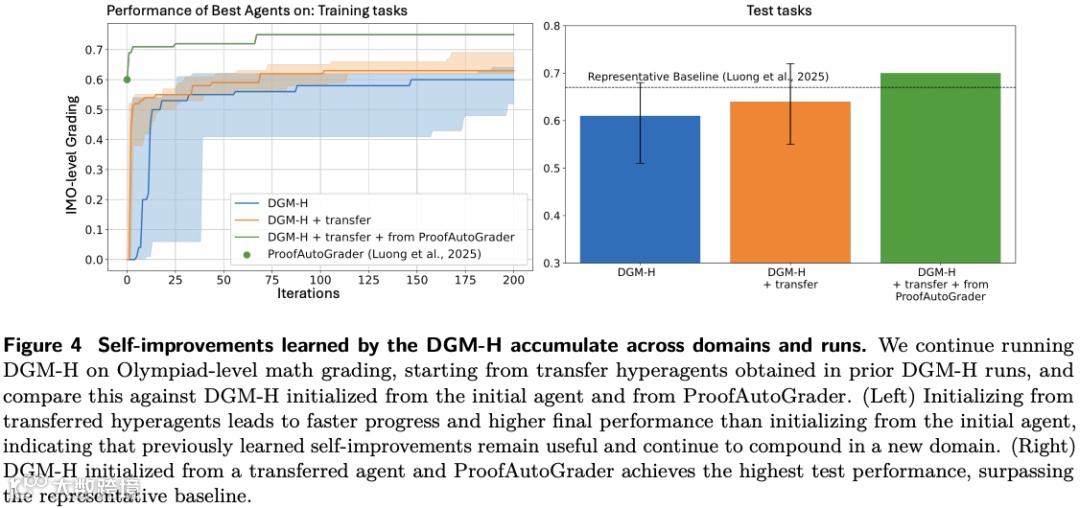 实验表明,HyperAgents可在编程任务外实现跨领域自我改进:在论文评审中得分从0提升至0.710,机器人奖励设计任务中从0.060提升至0.372,并将改进能力迁移至奥数评分等新领域。