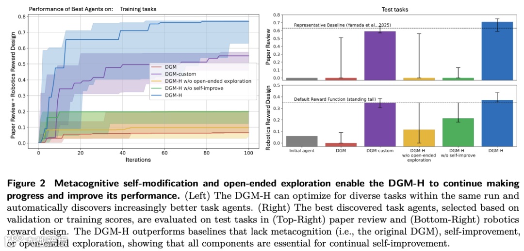当任务扩展至论文评审、机器人设计等非编程领域时,该对齐关系消失,导致原有框架失效。DGM需人工定制(DGM-custom)才能维持竞争力,暴露出改进机制被固化的根本局限。