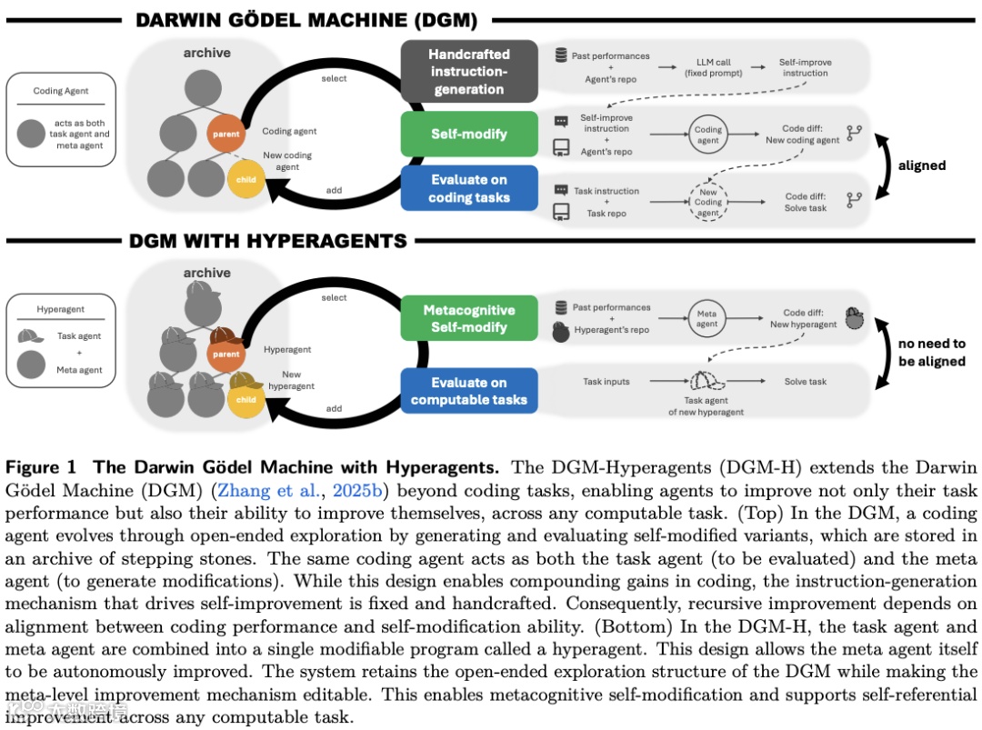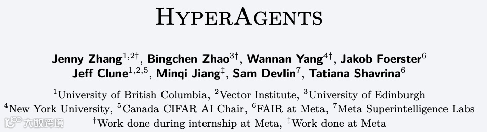 华人学者Jenny Zhang联合Meta AI、UBC等机构提出的HyperAgents(DGM-H),实现了元认知自我修改——即让AI能够调整"如何改进自身"的底层逻辑。