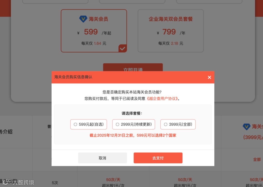 访问 vip会员 页面,点击 「海关会员」,勾选你所需的国家/地区(仅200元/个),支付后即可。