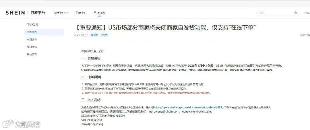 SHEIN公告明确此举旨在“加强物流链路的管控与整合”。