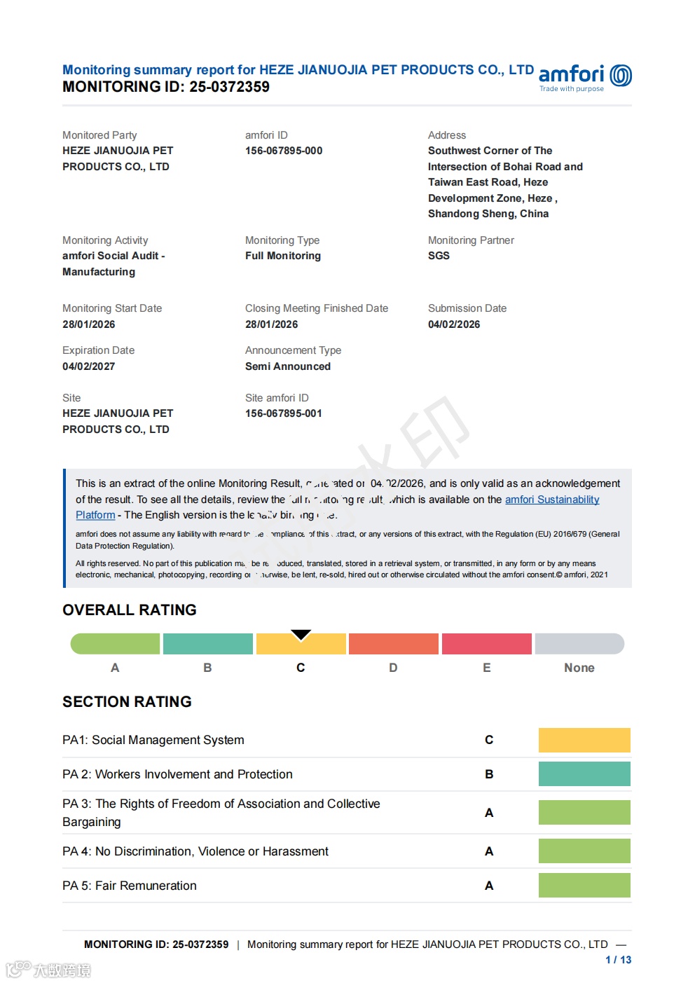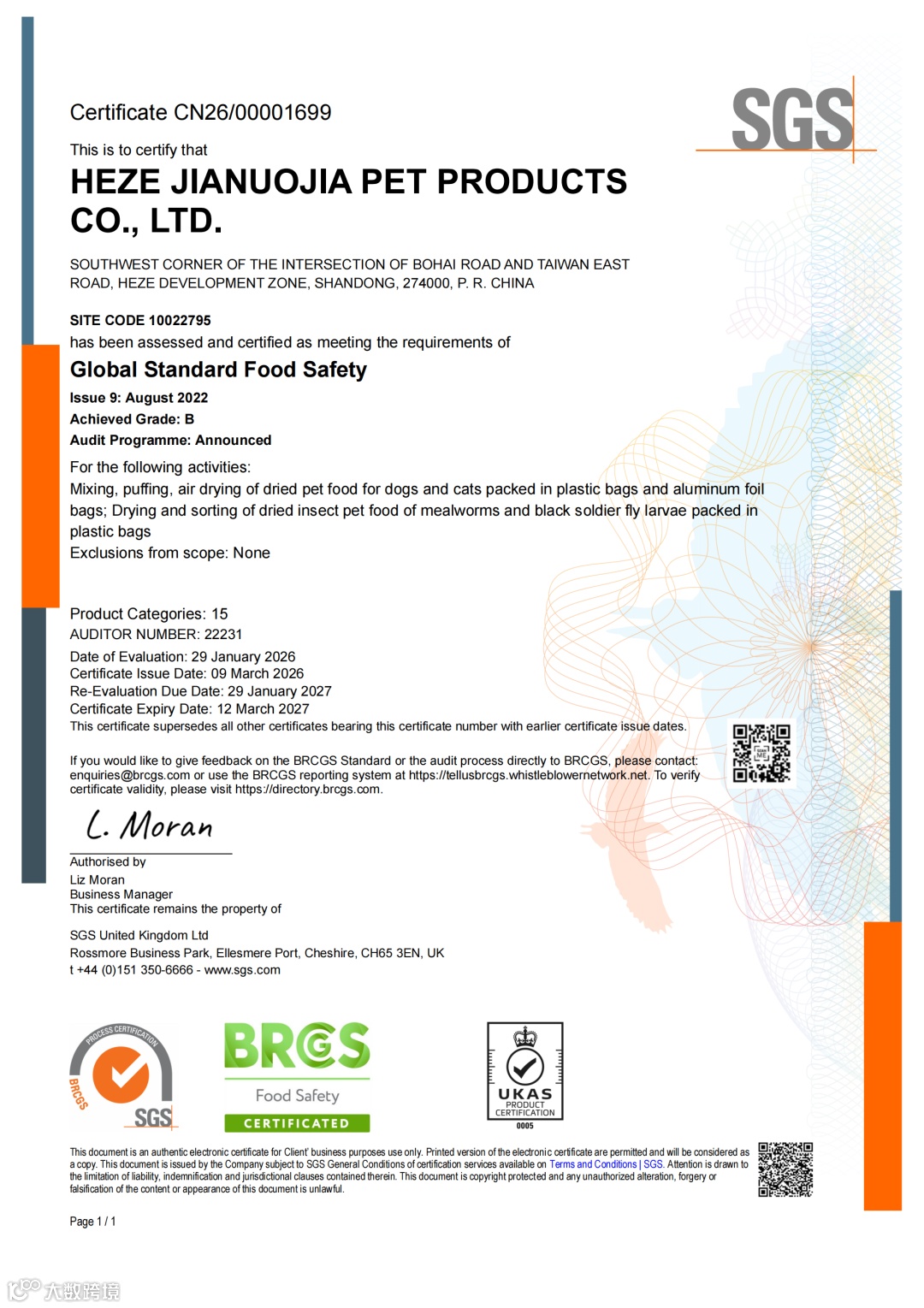 鲁宠协消息:近日,协会副会长单位——菏泽佳诺佳宠物用品有限公司顺利通过BRC全球标准食品安全认证、Amfori全球贸易协会BSCI认证,正式斩获两项国际通用、国家认可的权威认证证书。