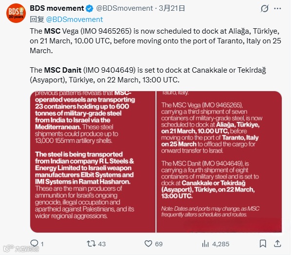 抗议活动最终取得了实质性进展——在各方压力下,意大利港口当局及码头工人对相关船舶的货物进行了拦截检查。意大利媒体后续报道称,检查过程中截获了多批计划运往以色列武器工厂的原材料及精密部件;BDS运动也发布公告证实,有3批运往以色列的军用级钢材在意大利被扣押,目前正接受进一步调查。