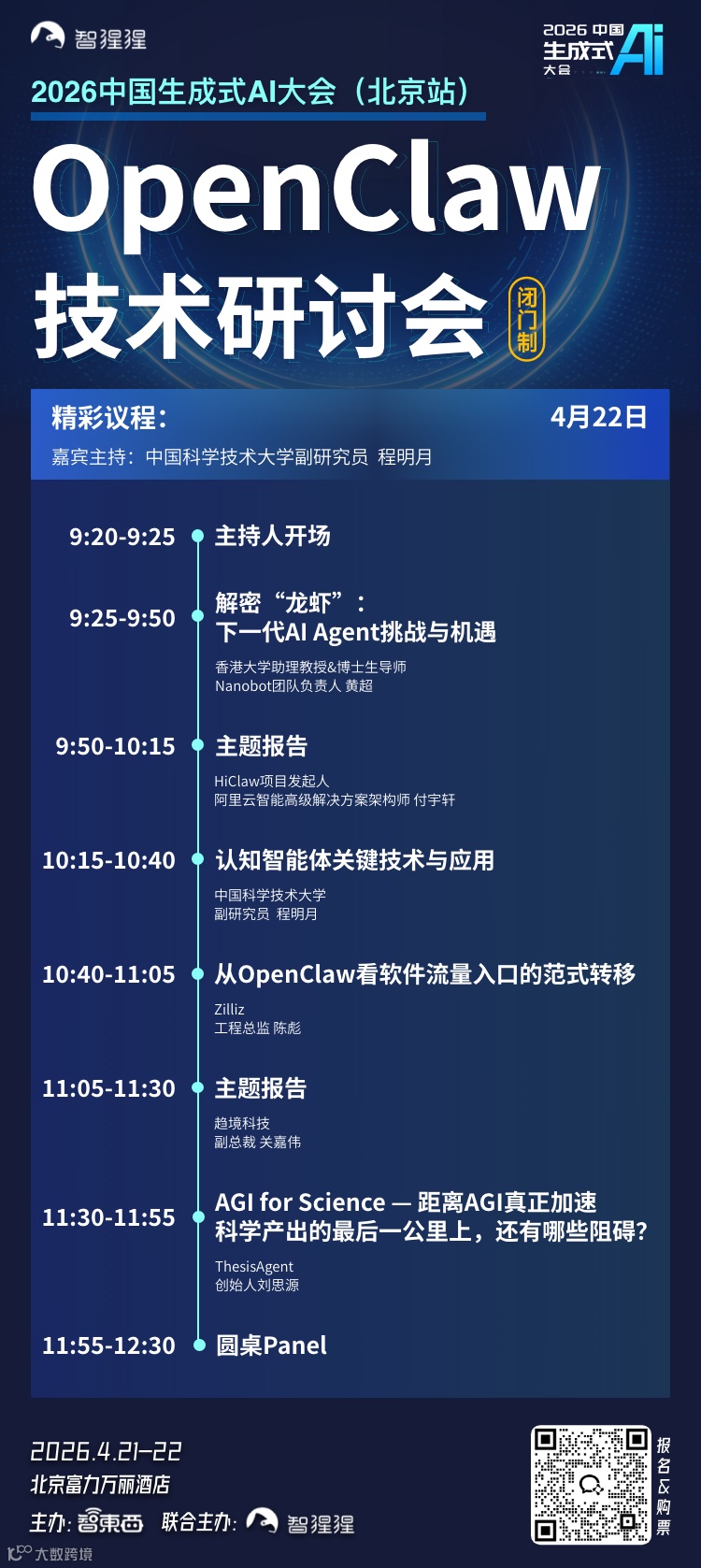 2026年开年,OpenClaw这一开源AI智能体框架迅速引发全民 “养龙虾” 热潮,成为AI从 “对话交互” 迈向 “主动执行” 的标志性事件。为此,智猩猩在大会同期也组织了OpenClaw技术研讨会进行深入拆解和探讨。这一研讨会将于4月22日上午在分会场进行。