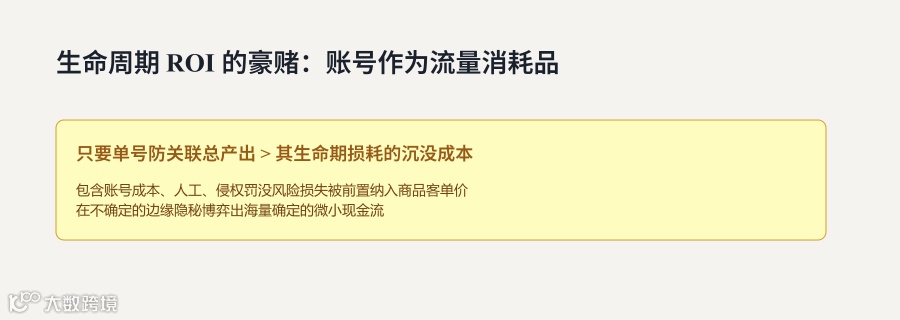 对他们而言,店铺未必当百年品牌养,更像一段周期内的流量容器:从注册或买入、养号、上新、出货,到可能被封或冻结,整条链路算 ROI。只要单号产出盖住成本(含人工和潜在罚没),模型就能滚。新兴平台或规则松动期,自然流量多,这套玩法更吃得开。