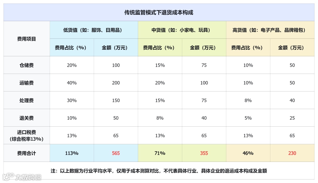 我们可以发现,在传统监管模式下,低货值商品退运成本可能接近甚至超过货值。这也解释了为什么大量低货值商品被直接弃置而不是退运。