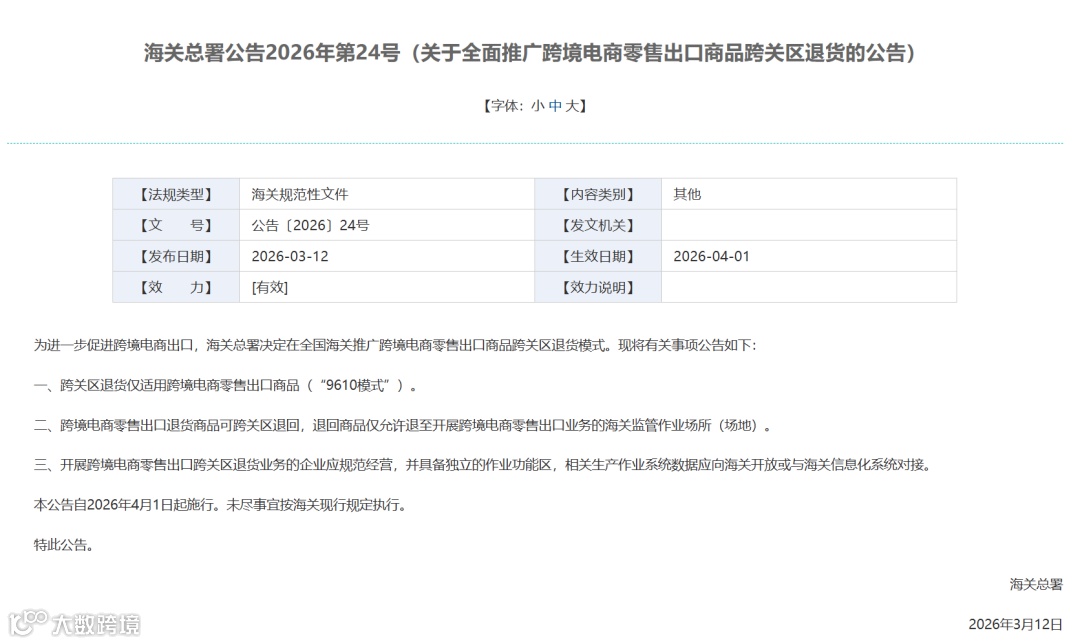 2026年3月12日,海关总署发布《关于全面推广跨境电商零售出口商品跨关区退货的公告》(2026年第24号),明确自2026年4月1日起施行。