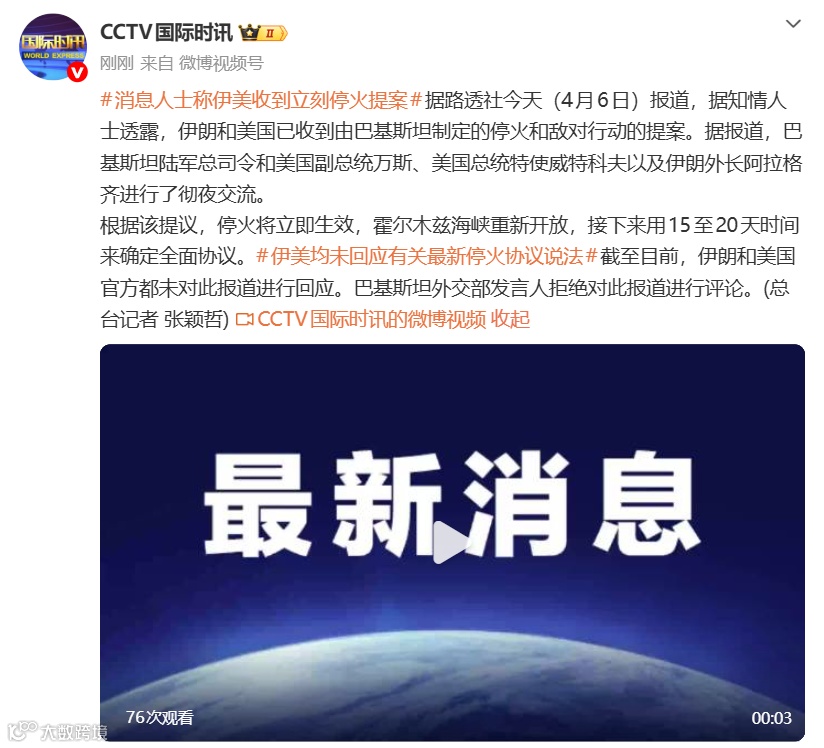 4月6日,路透社援引知情人士消息称,巴基斯坦已向伊朗和美国提交停火及结束敌对行动提案。巴方与美国副总统万斯、总统特使威特科夫及伊朗外长阿拉格齐进行了通宵磋商。