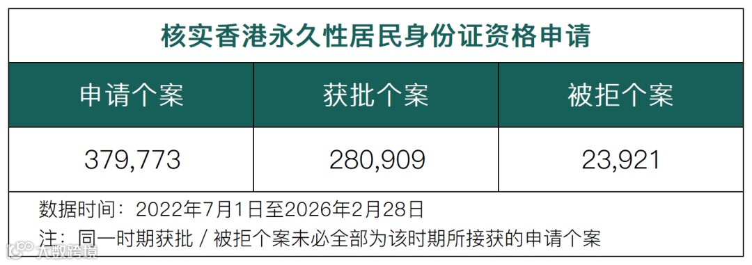 2022年7月1日至2026年2月28日,永居申请累计379,773宗,获批280,909宗,拒批23,921宗,整体通过率约74%。数据显示,符合条件的申请获批概率较高。