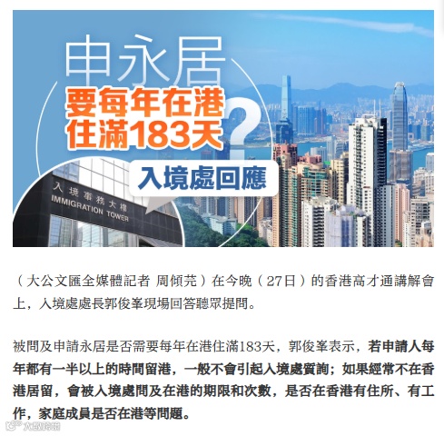 邓炳强局长明确:入境处对不符合法定条件的申请无酌情权。永居审批不唯天数论,年在港满半数时间通常不会引发审查;离港超180天但有合理解释(如外派、海外深造)并提供证明材料仍可获批。