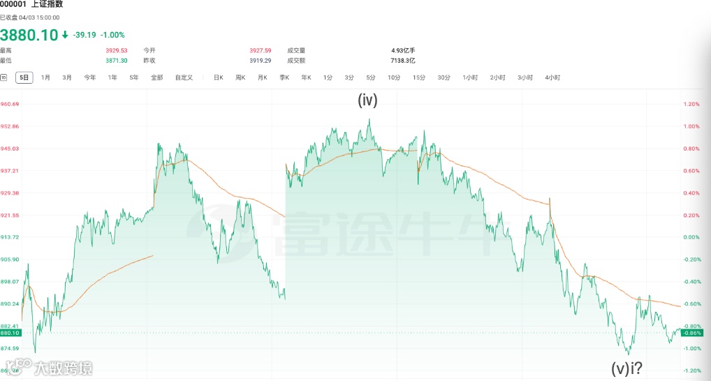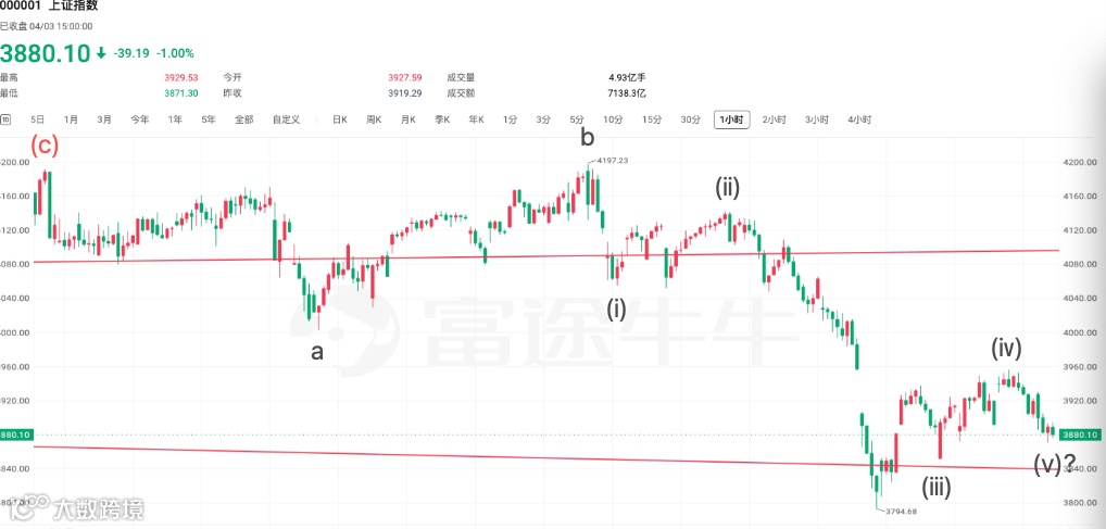A股中级反弹尚未完全确认,需观察指数是否守住关键支撑位。当前走势结构显示,周三高点3955.94点终结了自4197.23点开始的c(ⅳ)浪,进入最后阶段的下跌推动浪c(ⅴ)浪。