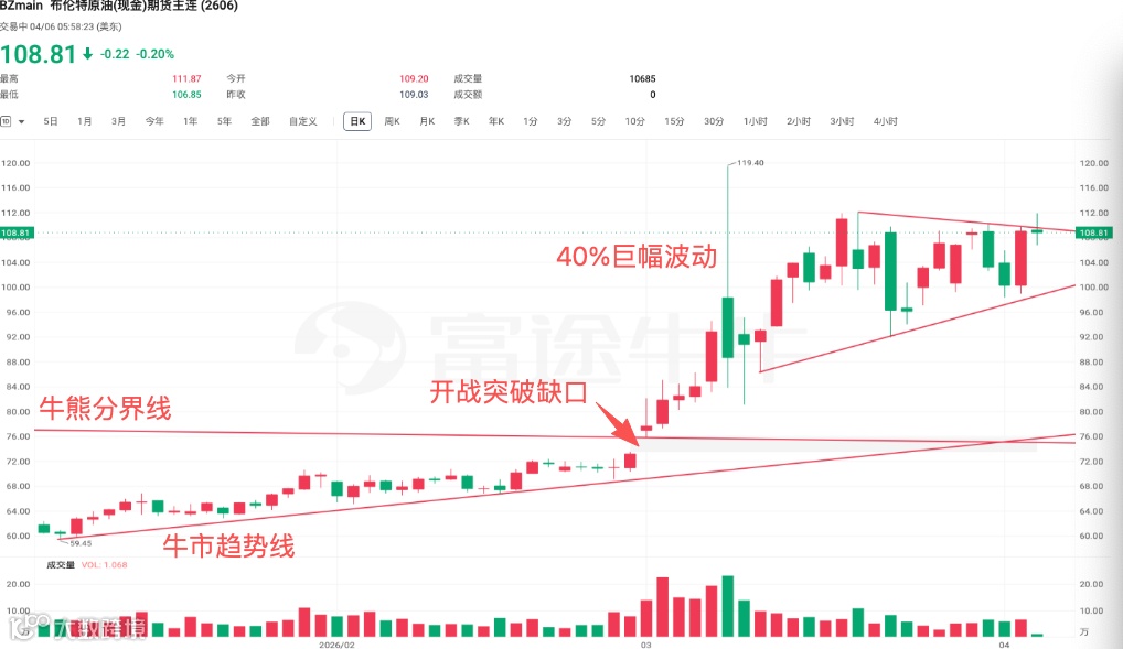 原油价格在突破110美元/桶后迅速回落,三角形整理形态暂判为假突破。若测算成立,后续运行区间将维持在81.86-119.40美元/桶区间内震荡,理论目标147.54美元的暴涨风险暂缓。