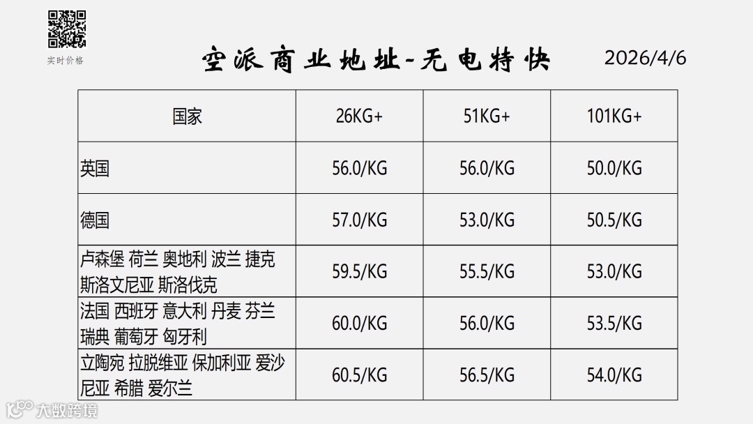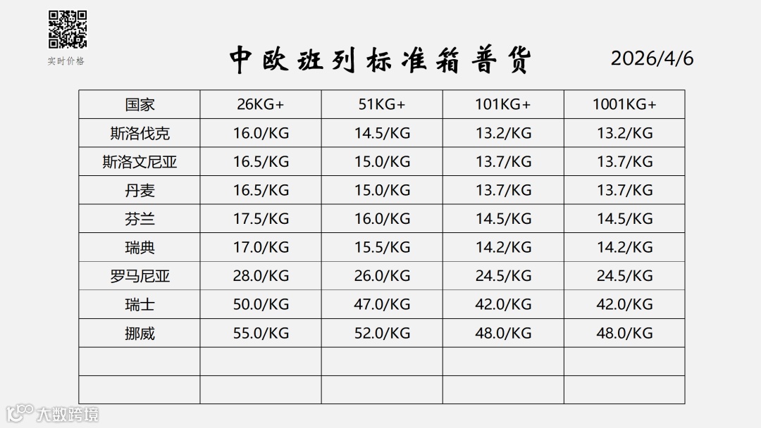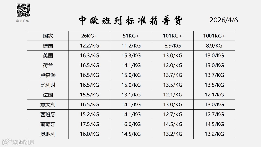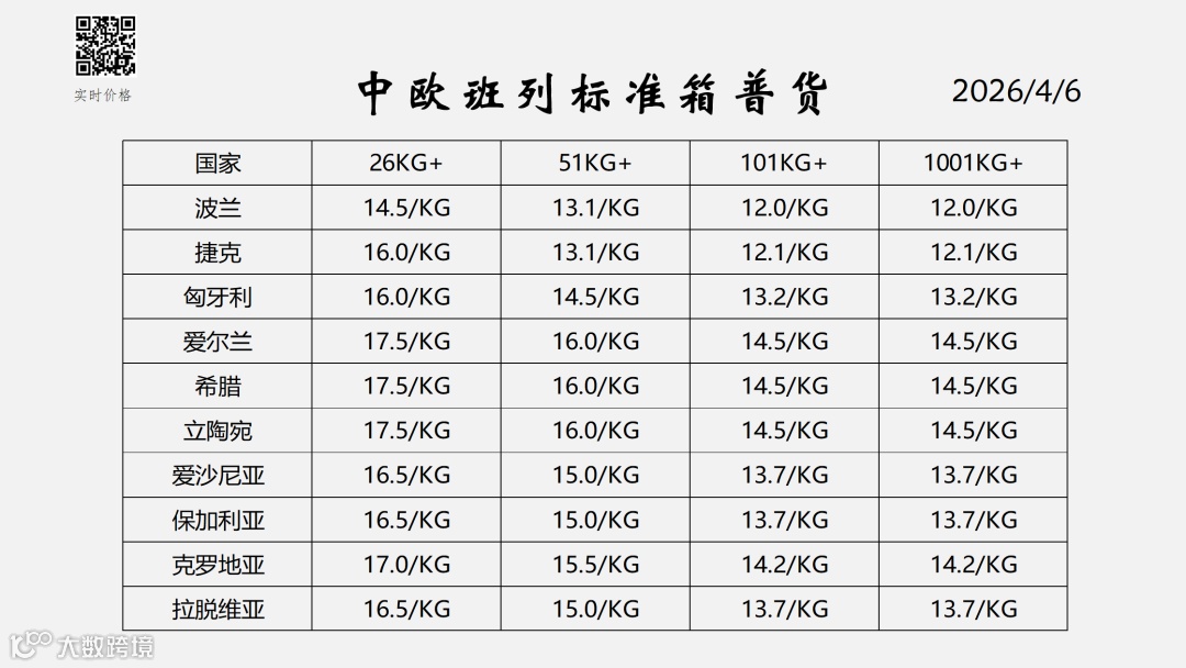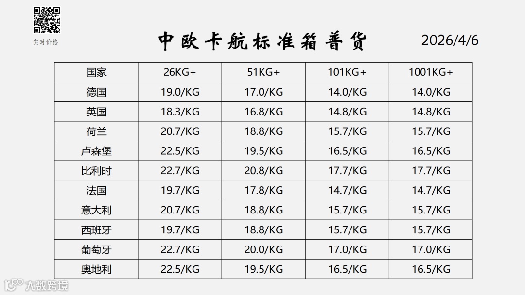 标准箱普货价格说明:非FBA地址加收1元/KG(最低100元/票);单箱限重13-23KG,一票不超过3个品名,一箱限1个品名;参考时效50-60天。普货包税,高税率或反倾销产品加收附加费1-6元/KG。首次进入欧盟包清关及关税,欧盟内部流通无需二次清关。东欧国家(如罗马尼亚、匈牙利)若产生二次清关费用,需收件方承担。