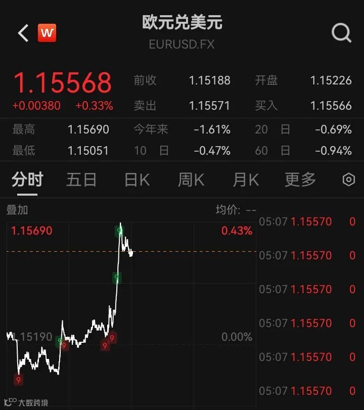亚洲时段,欧元/美元升至1.1570。欧央行鹰派立场(通胀需持续回落至2%)提供核心支撑。后市突破1.16需美元进一步走弱或更明确催化,关注地缘进展及利差变化。