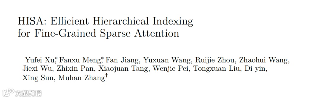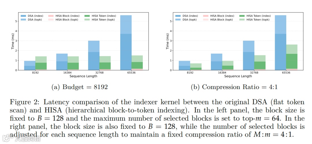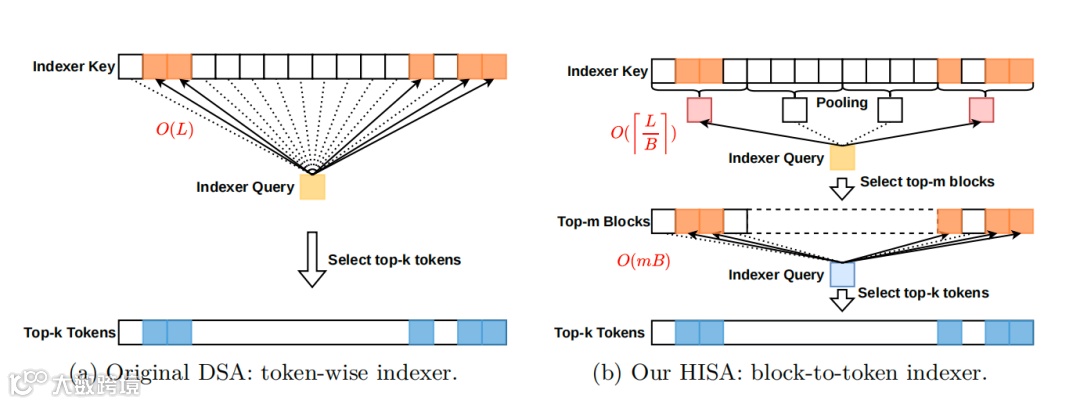 HISA将原索引器O(L²)复杂度降至O(L²/B + L×m×B)(B为块大小),实现速度飞跃。该机制无缝替换现有模块,无需修改下游计算逻辑或调整KV缓存结构,短文本自动退化至原方案。