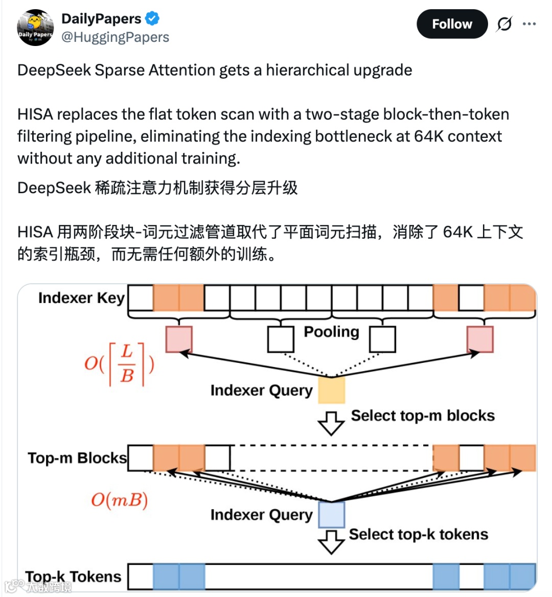 随着DeepSeek-V4发布临近,一篇提出HISA(分层索引稀疏注意力)机制的新论文引发关注。该技术突破64K上下文索引瓶颈,较DSA提速2-4倍。