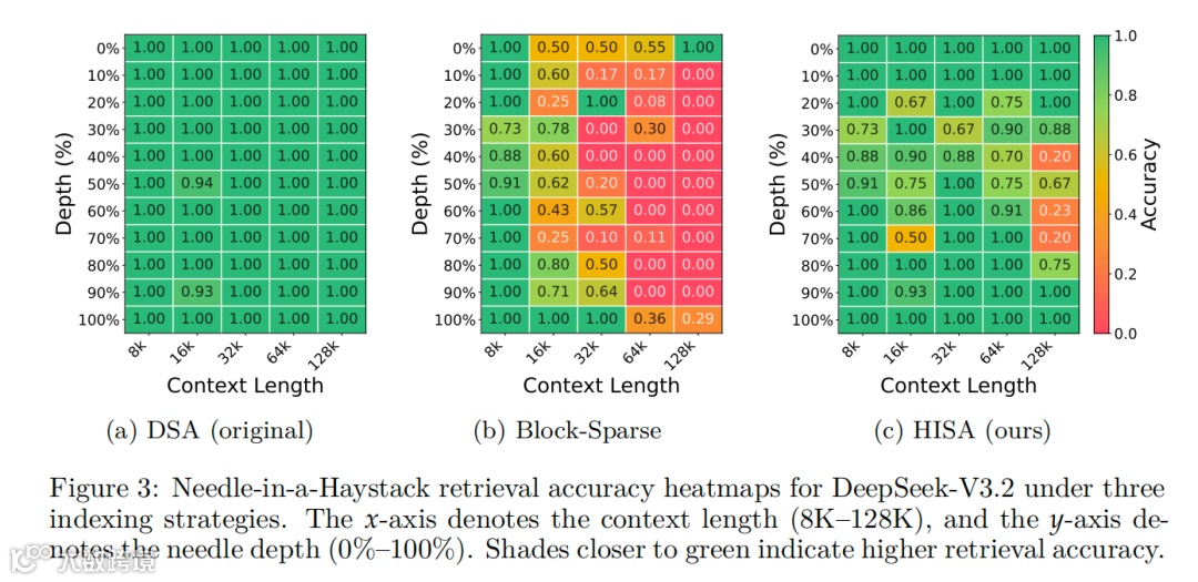 “大海捞针”测试中,HISA与DSA的检索精度几乎一致。LongBench长文本理解基准显示分数高度匹配,合成检索及少样本任务甚至实现小幅超越。