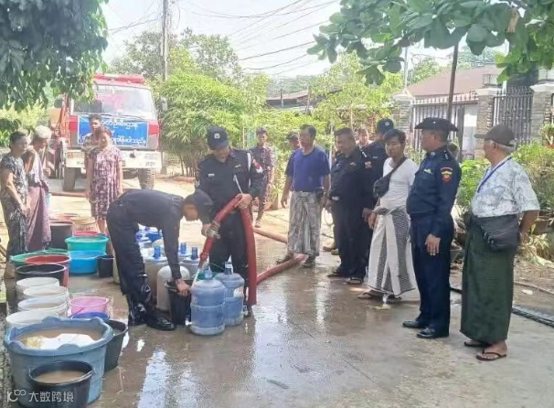 4月3日起,缅甸消防部队启动饮用水捐赠,重点覆盖九文台镇区玛基丹北/东街区等区域家庭;4月4日扩大至苗德贡镇区第50街区等更多地点,有效缓解民众饮水困境。