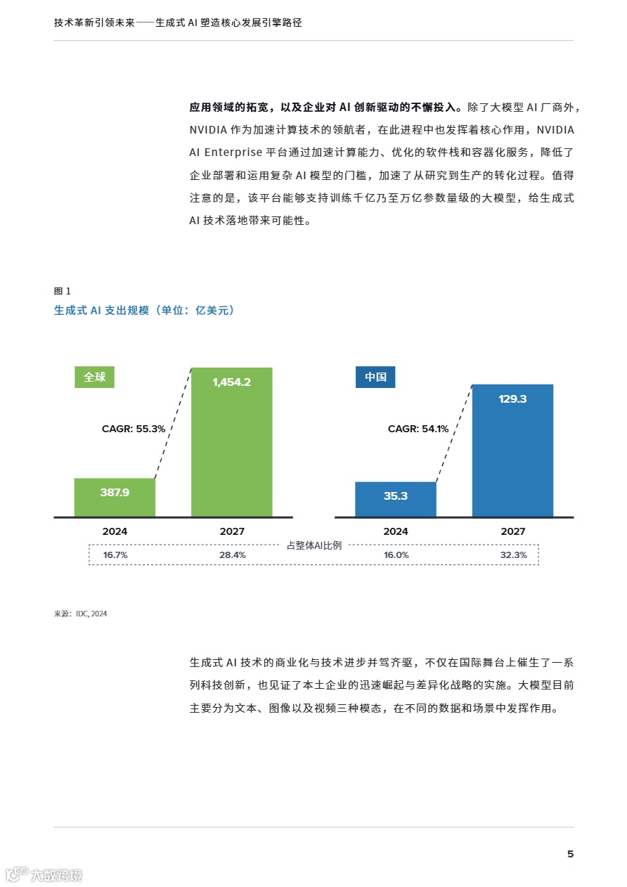 • 全球市场规模将持续爆发:IDC预计2027年全球生成式AI市场规模达1454亿美元,其中中国投资规模为129亿美元,成为企业数字化转型的核心增长引擎。