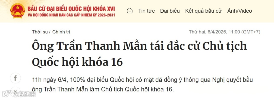 当地时间4月6日上午,陈青敏在越南第十六届国会上当选为国会主席。