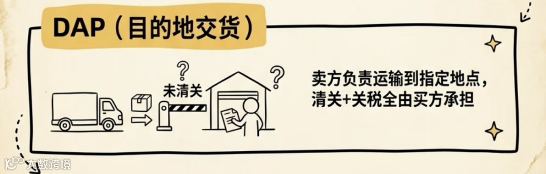 DAP(目的地交货):卖家把货运到买家指定地点,卸货前责任全归卖家,只管送货、不管清关,不承担目的港关税。