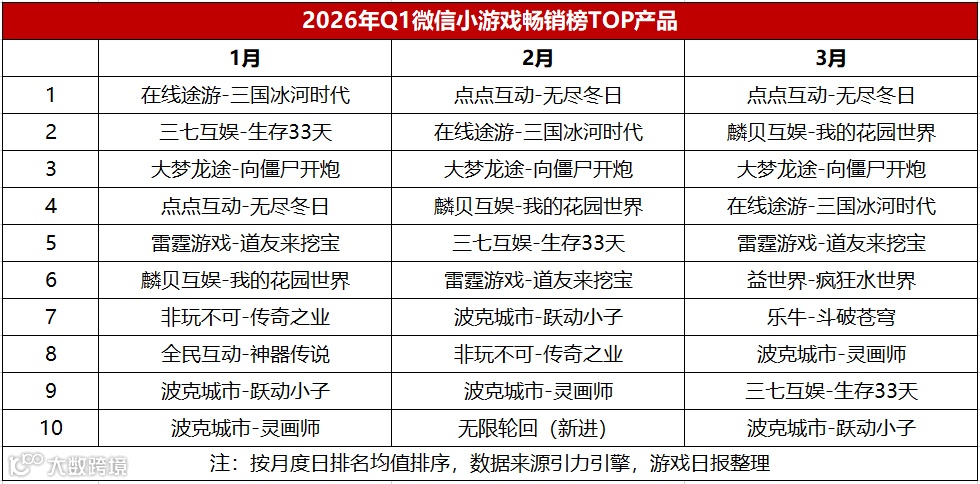 在此背景下,2026年第一季度微信小游戏产品层面呈现新动态。通过整理月度TOP100畅销产品共性,发现5个关键变化: