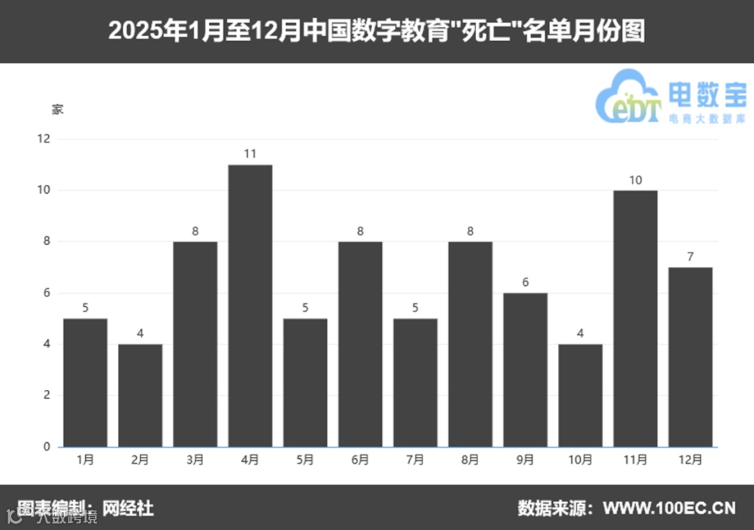 2025 年数字教育领域各月份 “死亡” 企业的数量,其中4 月淘汰企业最多,达11 家;其次是11 月,10 家;3 月、6 月、8 月各8 家;1 月、5 月、7 月各5 家;9 月 6 家;12 月 7 家;2 月、10 月各4 家。