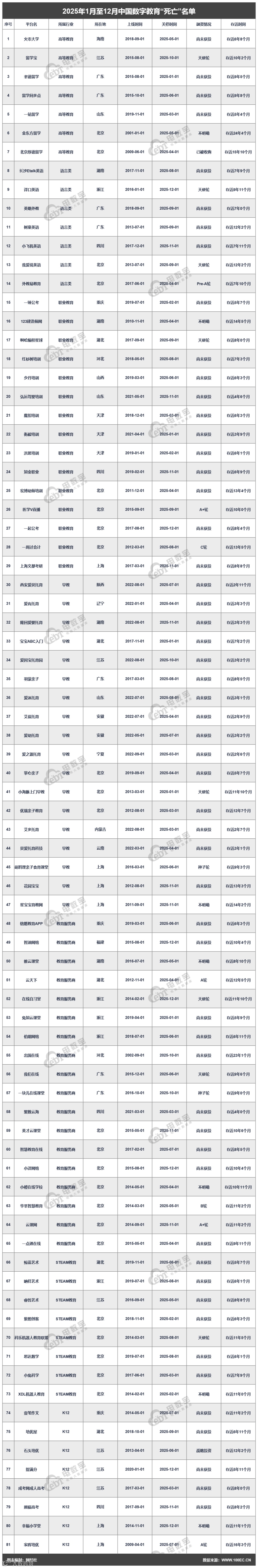 《报告》显示,2025年数字教育“死亡”公司有: