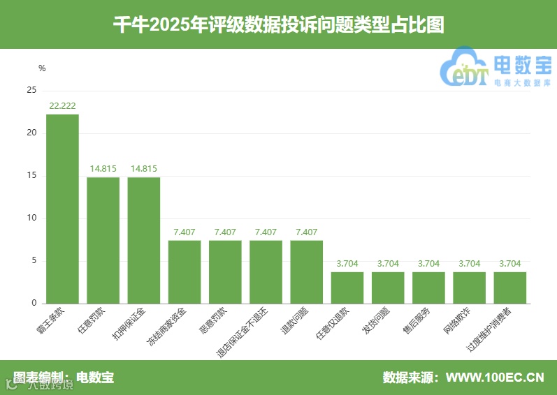 2025年“千牛”涉嫌存在霸王条款、任意罚款、扣押保证金、冻结商家资金、恶意罚款、退店保证金不退还、退款问题、任意仅退款、发货问题、售后服务、网络欺诈、过度维护消费者等问题。