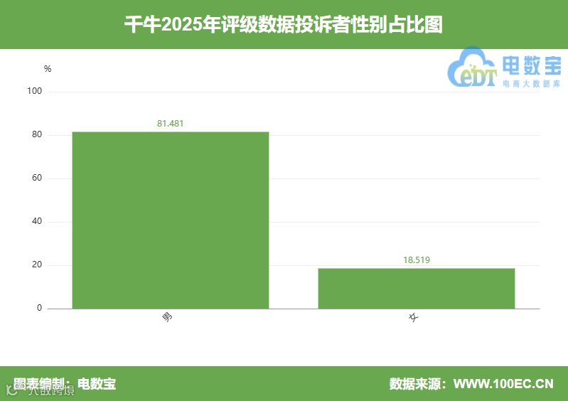 根据网经社旗下电商大数据库“电数宝”显示,投诉“千牛”男性用户投诉比例为81.481%,女性用户投诉比例为18.519%。